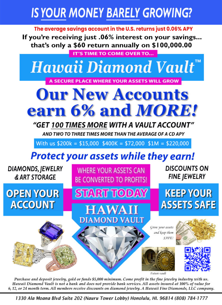 Only with Hawaii Diamond Vault can you store your valuables and earn 6% - 30% interest... and more.